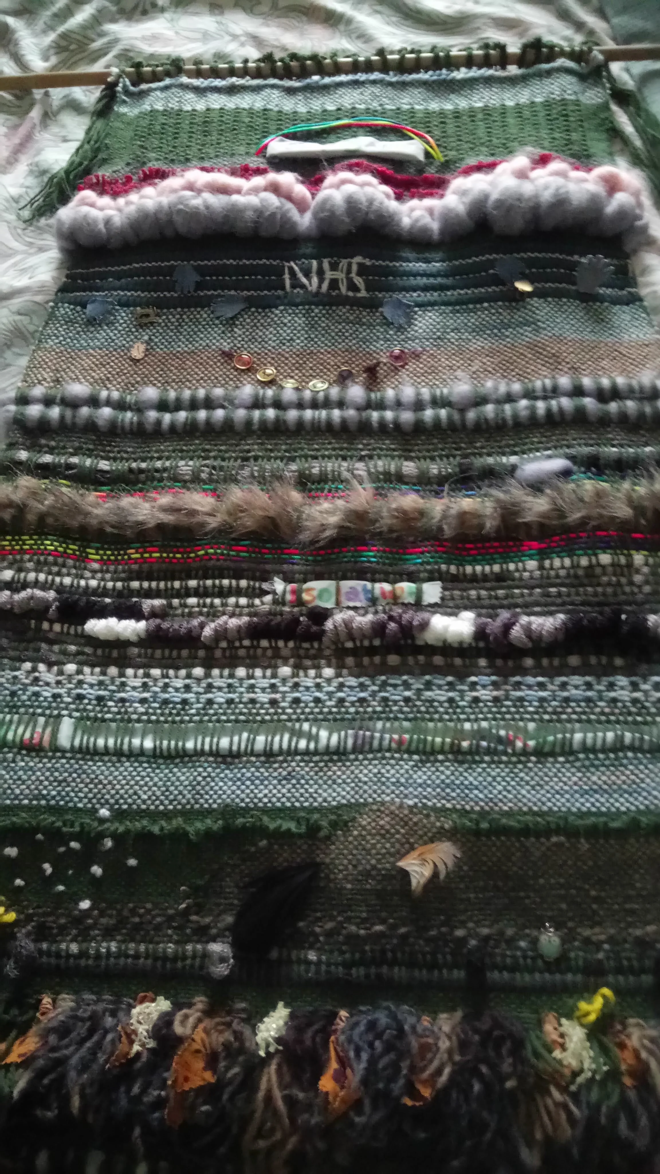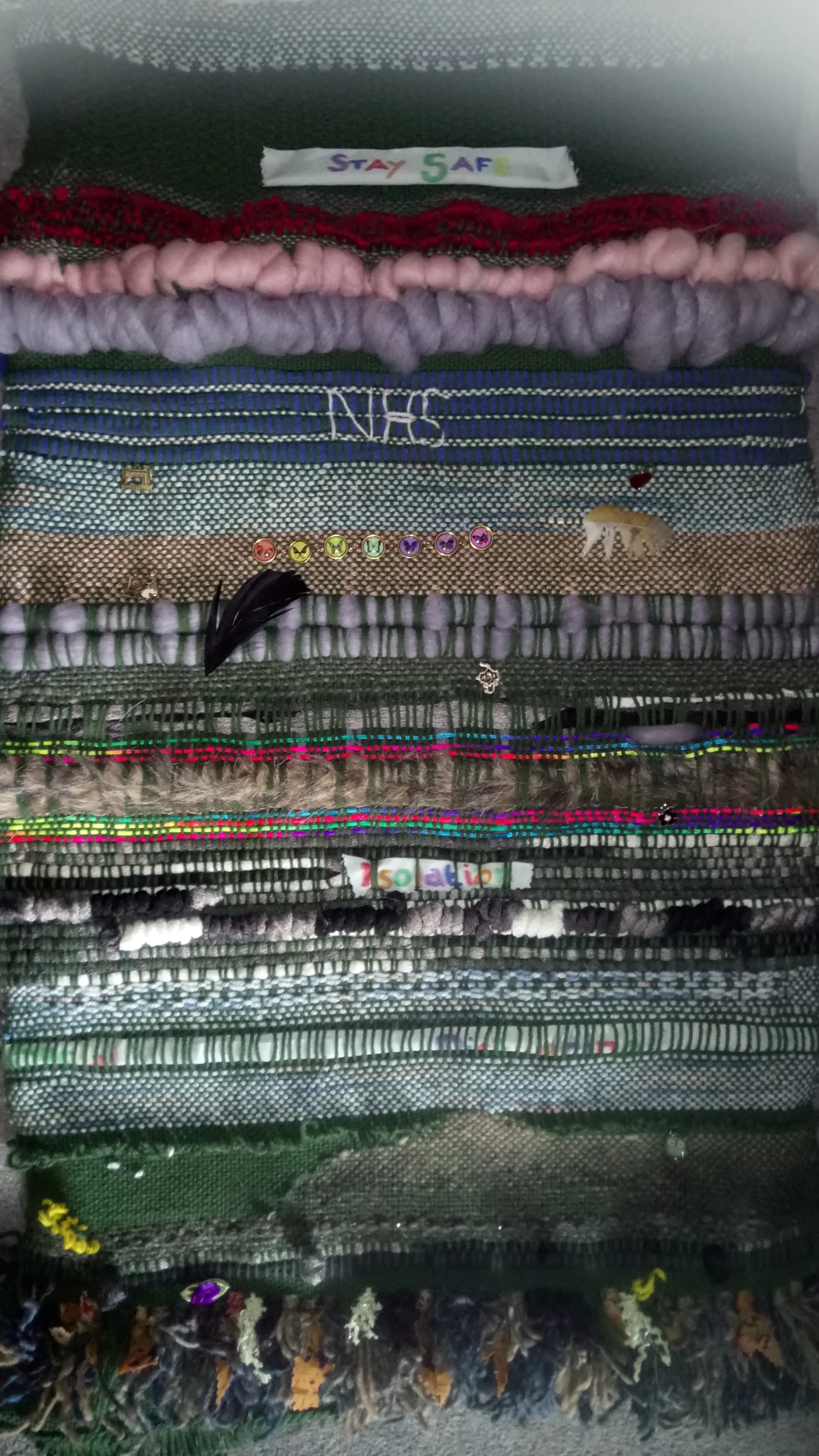 I first learnt to weave at S2R in Huddersfield and eventually bought my own loom. My first solo project was my Covid19 tapestry, at the beginning of the first lockdown. I was inspired by a visit to the lakes which ended abruptly with the first lockdown. This was meant to be our first holiday since my mum passed away and a chance to focus on the future. Then tapestry is a depiction of my own personal journey.